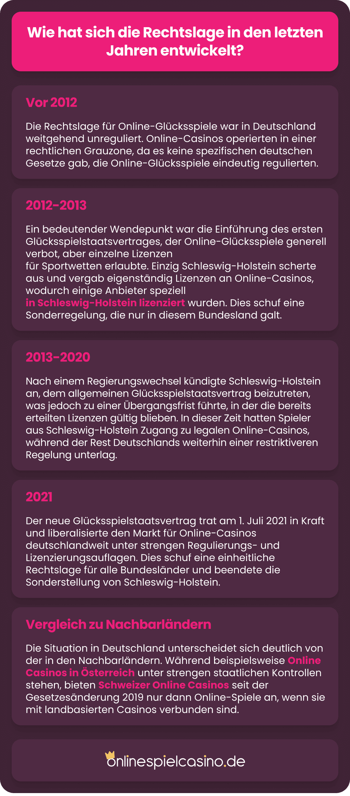 Legale Online-Casinos gibt es in Deutschland nicht erst seit 2021. Auch vorher konntet ihr bereits online verschiedene Automaten und andere Spiele ausprobieren. Allerdings waren die Rahmenbedingungen wie Zugänglichkeit, Einsatzlimits und Co. etwas anders. In den letzten Jahrzehnten hat sich einiges verändert.