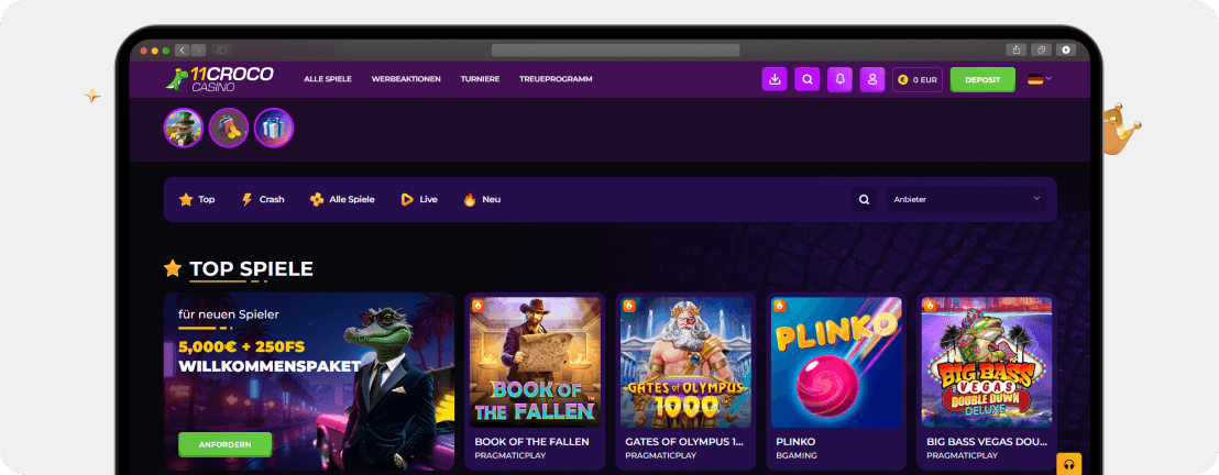 Die Webseite von 11Croco Casino setzt auf eine dunkle, stimmige Optik. Schwarze und violette Grundtöne werden durch grüne und goldene Akzente lebendig ergänzt und verleihen der Plattform einen markanten Look.