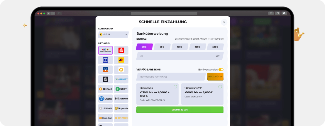 In meinem Casino Test habe ich zahlreiche Zahlungsmöglichkeiten per Banküberweisung entdeckt. Unterstützt werden dabei bekannte Banken wie die Sparkasse, Deutsche Bank, Raiffeisenbank, Commerzbank und Postbank. Einge E-Wallets und viele Kryptowährungen sind auch dabei: