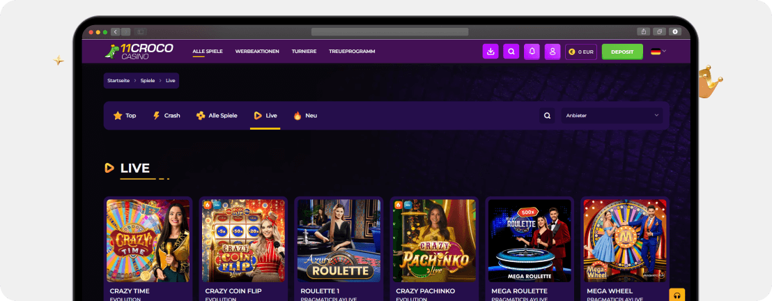 Im Live-Casino von 11Croco Casino stehen euch über 500 Spiele zur Verfügung, die ihr nach Anbieter filtern könnt. Vertreten sind renommierte Studios wie: