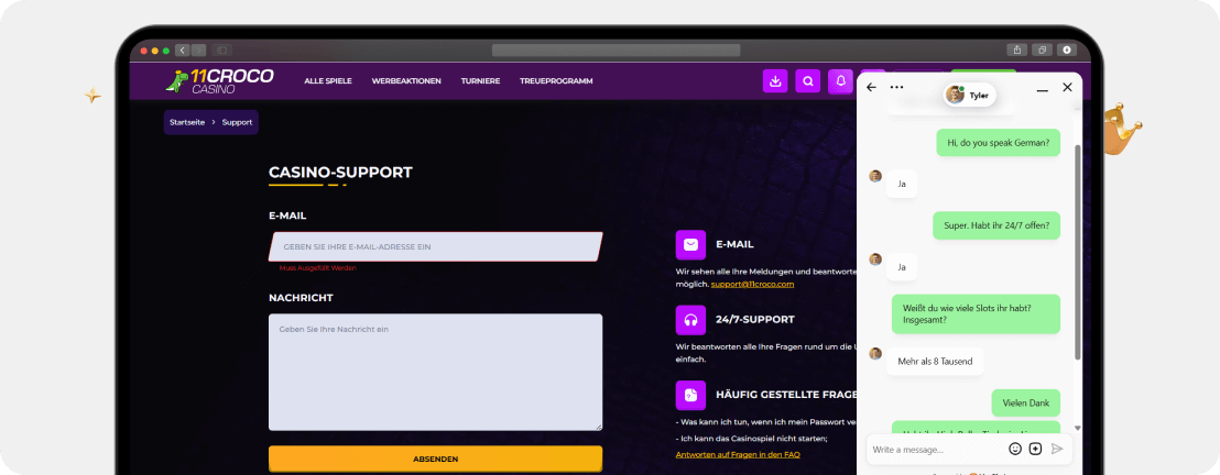 Der Live-Chat im 11Croco Casino hat in meinem CasinoTest einen hervorragenden Eindruck hinterlassen. Die Antwortzeit betrug nur wenige Sekunden, und ich wurde von einem deutschsprachigen Mitarbeiter betreut. Ganz ohne Bot. Alle Fragen wurden kompetent, klar und ohne Ausflüchte beantwortet.