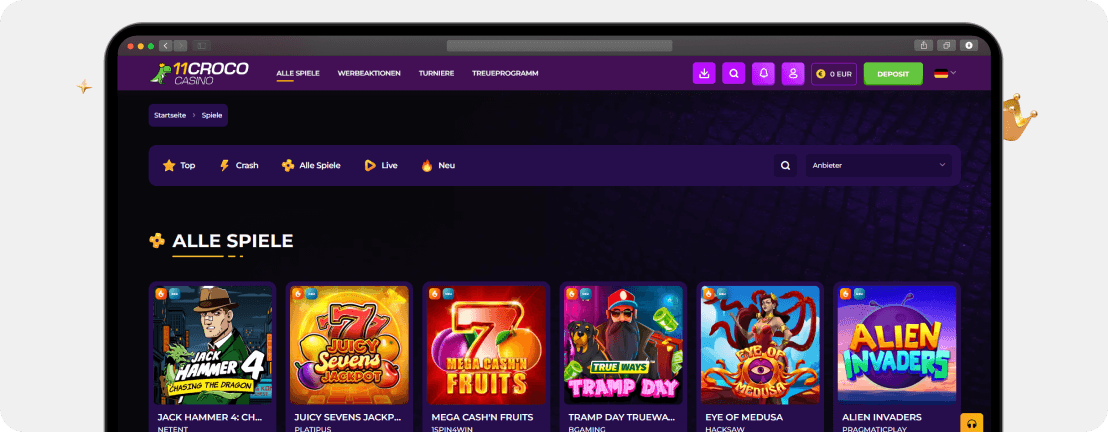 Das 11Croco Casino bietet euch eine vielfältige Auswahl von über 8000 Casinospielen. Zur Verfügung stehen klassische Tischspielen, eine Vielzahl an Spielautomaten, Live-Casino-Angebote sowie spezielle Krypto-Spiele. Die meisten Titel sind mit entsprechenden Zertifikaten zur fairen Zufallszahlengenerierung ausgestattet.