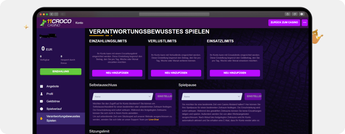 Im 11Croco Casino steht euch im Nutzerprofil eine eigene Rubrik für verantwortungsbewusstes Spielen zur Verfügung, in der ihr zahlreiche Schutzmaßnahmen individuell aktivieren könnt.