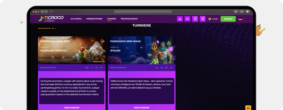 11Croco bietet regelmäßig spannende Turniere für Slots an, die sowohl wöchentlich als auch monatlich stattfinden. Besonders rund um Feiertage wie Weihnachten oder Ostern gibt es spezielle Wettbewerbe. Zu den Highlights zählt das bekannte Drops & Wins-Turnier 2025 von Pragmatic Play mit einem monatlichen Preispool von 2.000.000 €.