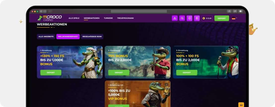 Im 11Croco Casino könnt ihr euch auf einen sehr attraktiven Willkommensbonus von 130% bis zu 1.000 € + 150 Freispiele freuen. Bei eurer ersten Einzahlung erhaltet ihr 30 sofortige Freispiele sowie weitere 120 Freispiele, verteilt über 4 Tage. Das sind jeweils 30 Freispiele pro Tag, beginnend 24 Stunden nach der Aktivierung.