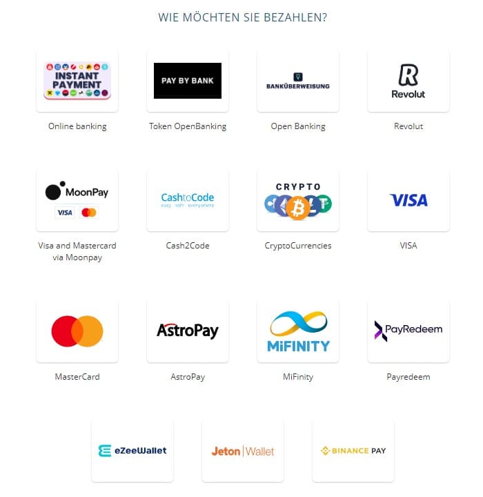 - Kryptowährungen (10€ - 2.000€), verfügbar sind unter anderen Bitcoin, Ethereum, Litecoin, Bitcoin Cash, Tether und Dash