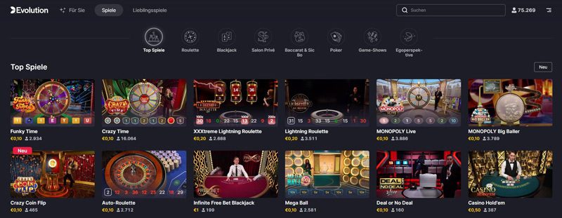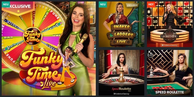 Wenn ihr im Live-Casino zockt, könnt ihr zwischen zahlreichen Spielen und Gameshows wählen. Die nachfolgende Übersicht verschafft euch einen detaillierten Überblick über das Portfolio: