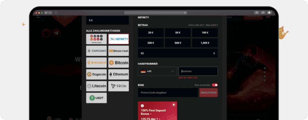 - 2Bonus aktivieren: Einige Deals funktionieren automatisch, andere verlangen einen Promo Code. Gebt den Code direkt in der Kasse ein oder wählt den 250% Casino Ersteinzahlungsbonus aktiv im Zahlungsfenster bzw. Bonusbereich aus. Ohne den richtigen Mechanismus bekommt ihr kein zusätzliches Guthaben.