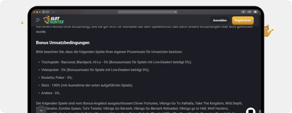 | Slothunter Casino | 275 % bis 4.000 € + 300 FS + 25 FS ohne Deposit | 50x nur Bonus, 30 Tage, kein Einsatzlimit | Hoch: nur Bonusumsatz und neben Slots auch Tische/Live-Casino umsatzberechtigt + sehr kurze Ausschlussliste + kein Einsatzlimit | Trustly, Paysafecard 250% Casino Bonus, Skrill, Neteller, ecoPayz (je nach Region), keine Methode ausgeschlossen | High-Roller & RTP-Strategen (Bester RTP im Test), die lange Zeit zum Durchspielen wollen | Jetzt Bonus sichern! |