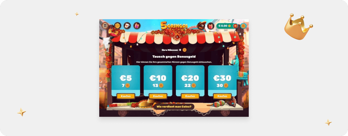 Für die Teilnahme an Turnieren erhaltet ihr zudem Münzen, die ihr im 5Gringos Casino Shop gegen Guthaben eintauschen könnt. Das gilt ebenfalls für die täglichen Missionen, die unter „Herausforderungen“ im Seitenmenü erscheinen. Überlegt euch gut, wann ihr eure Münzen eintauschen wollt. Cool ist auch der Schießstand, auf dem man durch gesammelte Kugeln (unter anderem im Shop erhältlich) auf Enten zielt und letztlich Boni und sogar Echtgeld gewinnen kann.