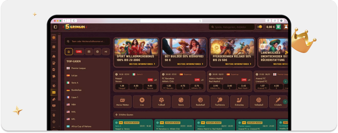 Die 5 Gringos Quoten sind gerade bei den großen europäischen Fußballligen durchaus wettbewerbsfähig, aber eben nicht ganz auf dem Niveau von Stand-alone-Bookies. Bei den Livewetten stehen sogar Streams bereit – und einen Wettkonfigurator gibt’s ebenfalls. Boosted-Odds, spezielle Boni (etwa der Pferderennen Reload bis 50 Euro), Cashout und weitere typische Features machen diese 5Gringos Casino Angebote zu einer runden Sache.
