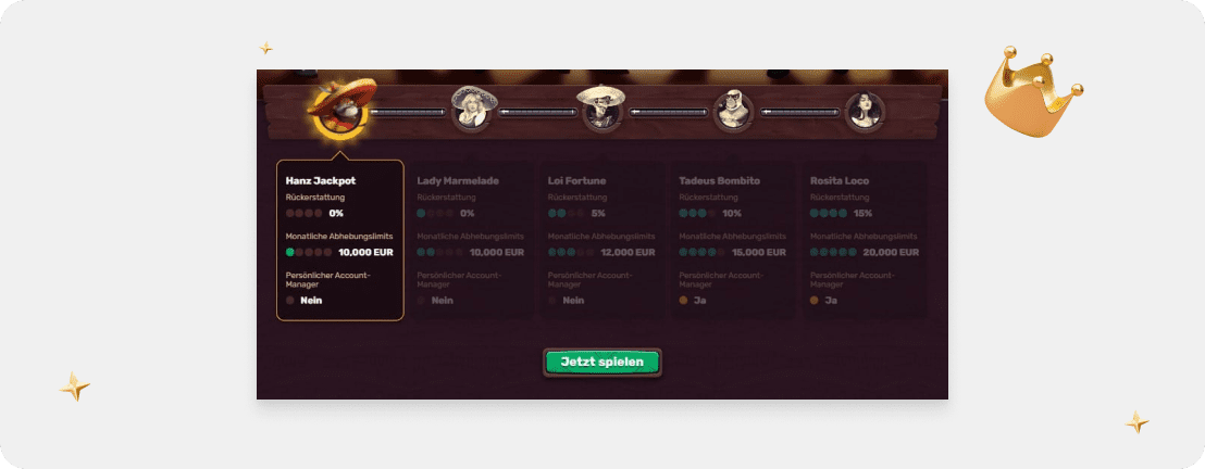 Um euren regelmäßigen Einsatz zu sichern, hat dieser Anbieter direkt vom ersten Tag an ein sinnvolles VIP- und Treueprogramm implementiert. Dieses ist an die im 5 Gringos Casino namensgebenden 5 mexikanischen Charaktere angelehnt.