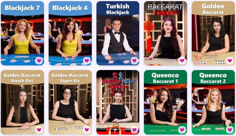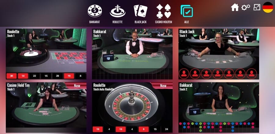 Im Live Casino findet ihr einige Möglichkeiten, Online Blackjack mit Echtgeld zu spielen, ein paar Tische zum Online Roulette spielen sowie Casino Poker, Baccarat, Andar Bahar und eine Art Lotterie, bei der ihr auf Zahlen setzen könnt.