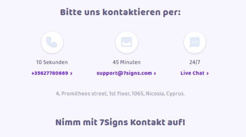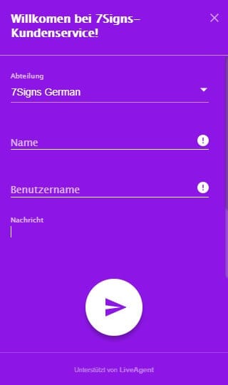 Den Support des 7Signs Casinos könnt ihr über verschiedene Wege erreichen. Am einfachsten ist die Kontaktaufnahme via Live-Chat.