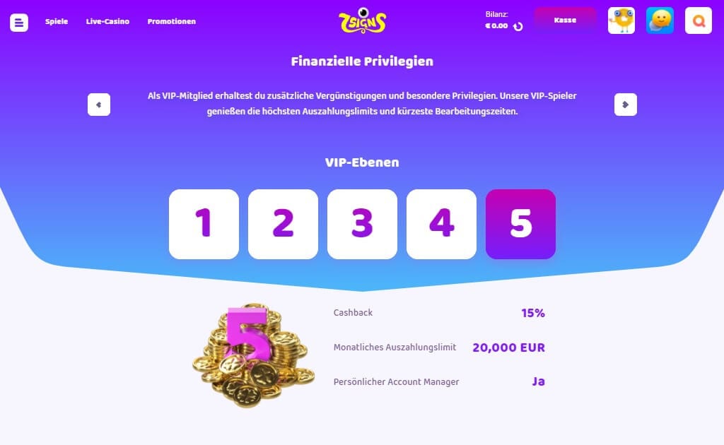 Im 7Signs Casino gibt es zudem ein Auszahlungslimit. Ihr könnt euch mit der niedrigsten VIP-Stufe nicht mehr al 500 Euro täglich auszahlen lassen. Außerdem dürft ihr ein monatliches Auszahlungslimit von 10.000 Euro nicht überschreiten. Mit höherer VIP-Stufe könnt ihr das monatliche Auszahlungslimit auf maximal 20.000 Euro erhöhen.