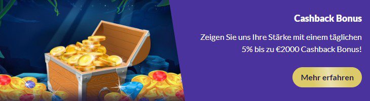 Zwischen 20 und 2.000 Euro sind auf diese Weise jeden Tag drin, was heißt, dass ihr mindestens 400 Euro verloren haben müsst. Das Cashback kommt als Bonusgeld mit 35-fachem Umsatz binnen sieben Tagen, wobei die weiteren Bedingungen wie beim Willkommensbonus sind. Die Summe kann mit Gewinnen maximal verfünffacht werden.