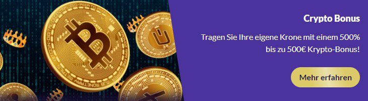 • Einmal täglich ist es möglich, über Kryptos mit saftigen 500 Prozent bis zu 500 Euro Bonusgeld einzuzahlen.