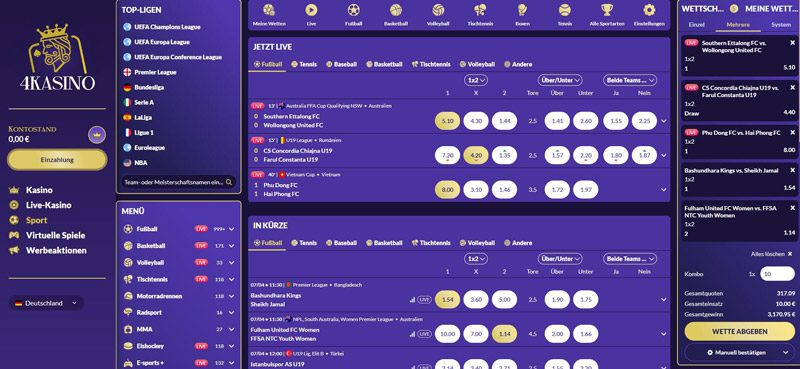 Ihr könnt zusätzlich beim E-Sport vorbeischauen oder die wenigen Spezialwetten aus Politik und Unterhaltung zocken. 4Kasino hat einen netten Wett-Konfigurator, der euch beim Fußball erlaubt, die perfekte Sportwette zu kreieren.
