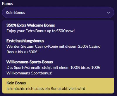 Den Willkommensbonus hätten wir ganz einfach bei der Einzahlung auswählen können. Um den Zahlungsvorgang zu beschleunigen, verzichteten wir jedoch darauf.