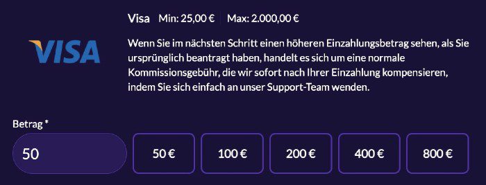Die erste Einzahlung in Höhe von 50 Euro erfolgte über unsere Visa-Kreditkarte. Umgehend und gebührenfrei stand das Geld für alle weiteren Schritte bereit. Eigentlich zahlen wir bei unseren Tests immer 30 Euro ein, wir haben uns diesmal aber einfach verklickt, weil 50 Euro schon vorausgewählt war. Deswegen lief dieser Test mit 50 Euro statt mit 30.
