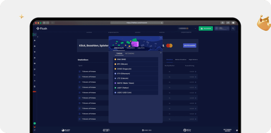 Das Flush Casino ist ein Krypto-Casino. Deswegen könnt ihr nur mit Kryptowährungen ein- und auszahlen. Es gibt allerdings auch die Option, bei der Einzahlung eine Kryptowährung zu kaufen. Die folgenden Zahlungsmethoden sind verfügbar:
