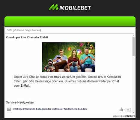 Sollten Probleme bei der Mobilebet Casino Anmeldung auftreten, steht ein kompetenter Kundenservice bereit. Den Button zum Kundenservice findet man immer oben rechts in gut sichtbar, leuchtendem grün. Die Mitarbeiter des Kundenservices beantworten Fragen per Mail umgehend, täglich von 08:00 – 22:30 Uhr oder im Live Chat, täglich von 10:00 – 21:00 Uhr.