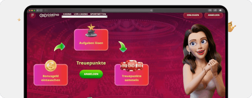 | Casino Infinity | 250 % bis 3.000 € + 300 FS + 1 Bonus Crab | 10.000+ | Ja, mit Playtech, Pragmatic Live und Iconic21 | Anjouan, international klar geregelt | Paysafecard für Deutschland und 10 Tage Umsatzfrist | Jetzt testen! |