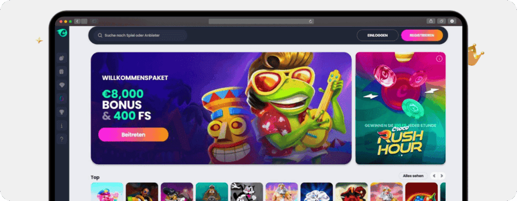 | Crocoslots | 300 % bis 8.000 € + 400 FS | 10.000+ | Das Beste von Evolution und Pragmatic | Costa Rica, international klar geregelt | Sehr hoher Bonus, 50 Freispiele ohne Einzahlung und tägliche Turniere | Jetzt testen! |
