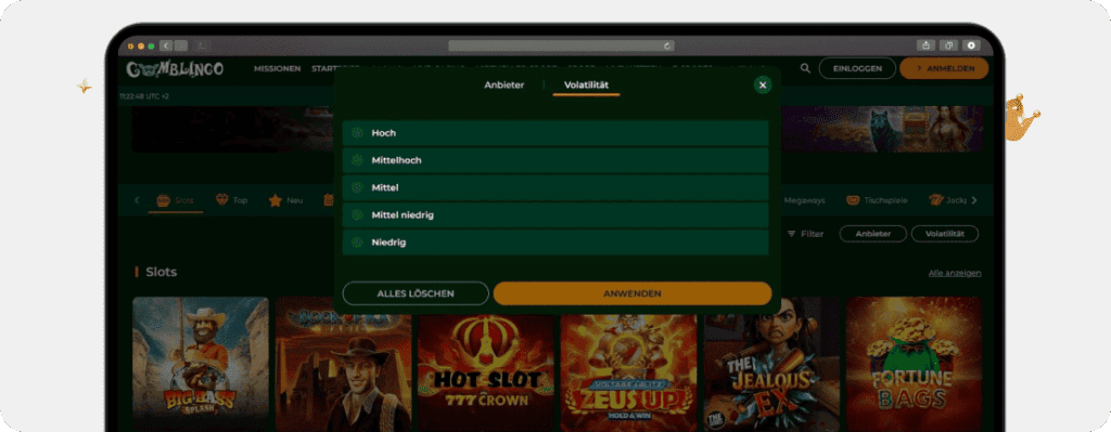 Ihr findet bei Verde online Slots, Tischspiele, Live Casino mit Pragmatic Play und Evolution, dazu Cash Games und Sofortgewinne und weitere gängige Formate. Auch Jackpots sind vorhanden. Weniger praktisch ist aber, dass es dafür keinen eigenen Bereich gibt. Insgesamt ist die Orientierung anderswo erheblich einfacher – etwa durch transparente RTPs wie im National Casino oder einen Volatilitäts-Filter im Gomblingo Casino (siehe Bild oben).
