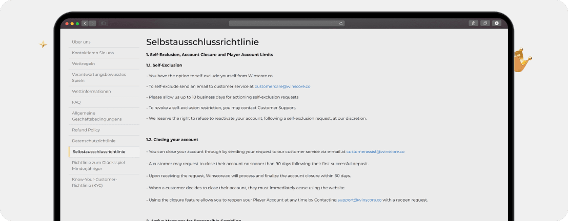 Das Winscore Casino ist auf Deutsch verfügbar. Leider gilt das nicht für die allgemeinen Geschäftsbedingungen, die nur auf Englisch angeboten werden. Im Footer-Menu funktionieren viele Links nicht. Wenn ihr auf die Links klickt, wird nur die normale Startseite aufgerufen. Das ist ein peinlicher Fehler, der schleunigst behoben werden sollte.