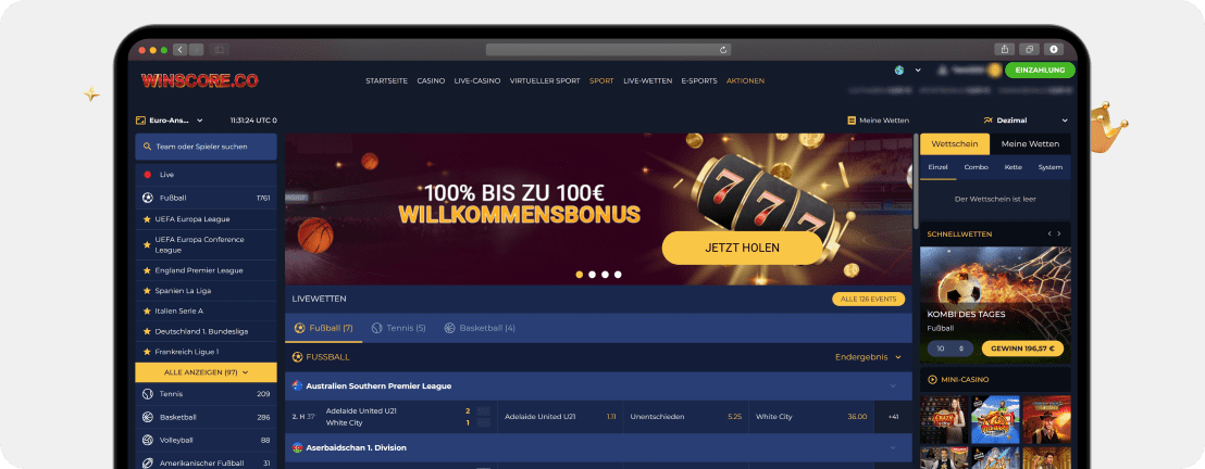 Winscore ist auch ein Wettanbieter mit über 40 Sportarten im Programm. Das ist top. Fußball steht im Mittelpunkt, aber auch alle anderen großen Sportarten und viele Randsportarten werden abgedeckt.